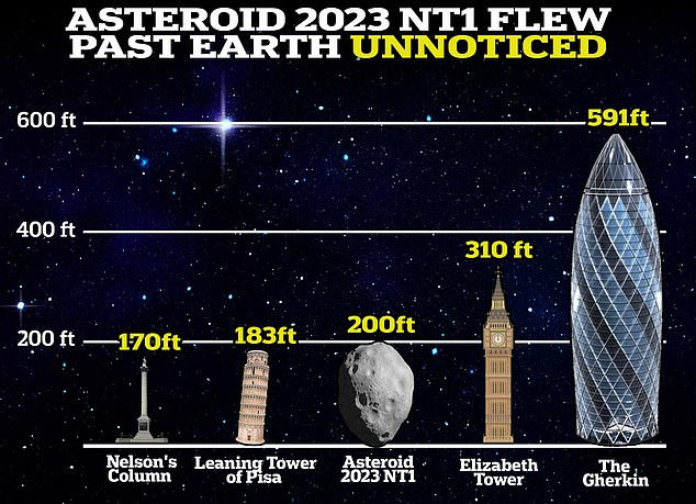 Ο αστεροειδής 2023 NT1, ο οποίος τώρα απομακρύνεται από τη Γη με ταχύτητα περίπου 25.000 μιλίων (40.233 χιλιόμετρα) την ώρα, έχει διάμετρο έως και 200 πόδια (60,96 μέτρα), δηλαδή μεγαλύτερη από τον Πύργο της Πίζας.